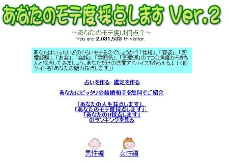 あなたのモテ度採点します Ver.2 ■あなたのモテ度採点します Ver.2あらゆる角度がからモテ度を判定してくれます。私の場合はCランクでした。 容姿が悪いのに口達者で雰囲気がいいってかんじで総合するとCランクでした。質問形式であたはまるものにチェックするだけです。 [1回]PR